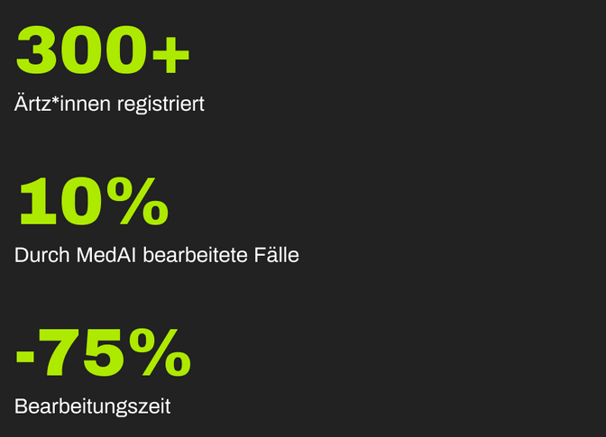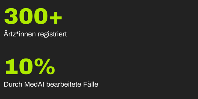 Die Plattform MedAI wurde Ende 2024 mit einer ersten Version fuÌr ausgewählteÄrzt*innen lanciert. So konnten wir das Tool mit ersten Nutzer*innen testen, welcheein Konto erstellt und Dossiers bearbeitet haben. Nach den ersten 6 Monaten dieser Pilotphase (ohne aktive Kommunikation seitens des OAI) hatten sich bereits uÌber 300 Ărzt*innen registriert, und etwa 10 % der medizinischen Berichte liefen bereits uÌber MedAI. Das OAI schĂ€tzt, dass sich die Bearbeitungsdauer der Dossiers um den Faktor 4 verkuÌrzt hat. Ein mehr als ermutigendes Ergebnis.