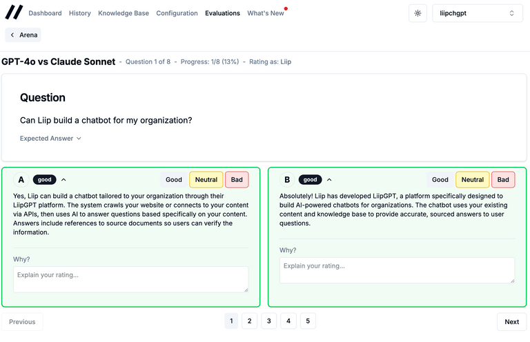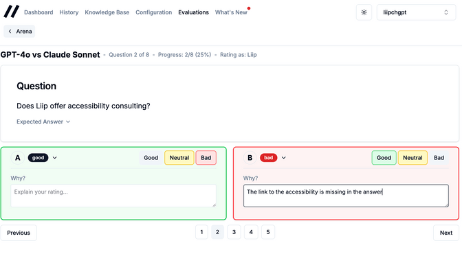 At Liip, we've been building and running AI-powered chatbots for organizations through our LiipGPT platform. Over time, we developed evaluation sets, automated scoring with LLM-as-a-Judge, and various ways to measure chatbot quality. Max wrote about this approach in No value without trust. But when it comes to comparing two different configurations, like a new prompt versus the old one, or GPT-4o versus Claude Sonnet, automated metrics only get you so far. Sometimes you need actual humans reading actual answers and telling you which one is better.