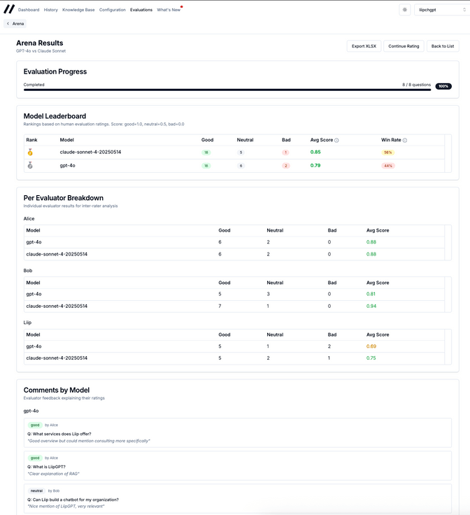 We're considering adding support for more than two models in a single comparison, and possibly integrating the Arena ratings as ground truth labels for training better LLM-as-a-Judge prompts. For now, blind human evaluation with a simple Good/Neutral/Bad rating scheme gives us exactly what we need: honest answers about which configuration actually works better.