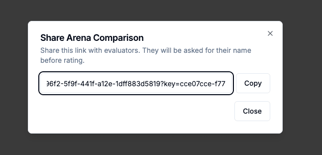 Multiple evaluators can rate the same comparison independently. Getting people involved is easy: share links generate a temporary API key, so you can send a URL to a colleague or a client and they can evaluate in a protected area without needing an admin account. They just enter their name and start rating.