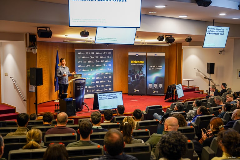 Just before lunch break, it was time for me to present the different AI use cases we implemented for Kanton Basel-Stadt. The canton set new standards with the bs.ch relaunch with user-centred design, topic-based access instead of internal org structure, and Alva as the first AI-based chatbot for a Swiss canton. The stack is based on open source components and Liip heavily contributed to open source as part of this relaunch. We use Drupal as CMS, Nuxt/Vue, the blökkli editor for the headless frontend and Elasticsearch for search. Content is produced by a cross-department editorial team following a clear content strategy.