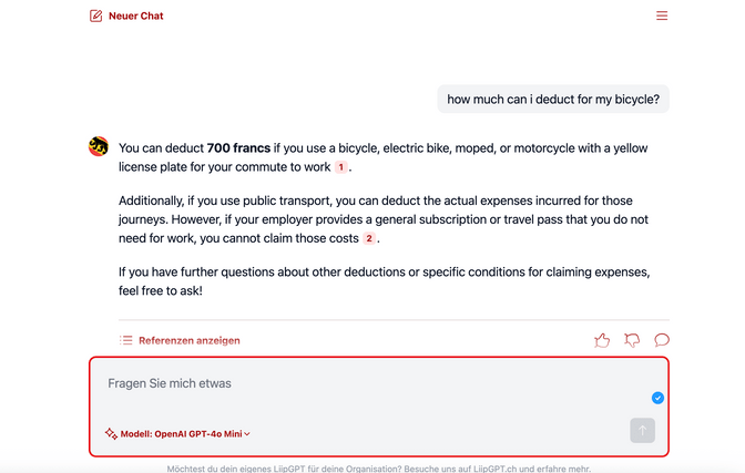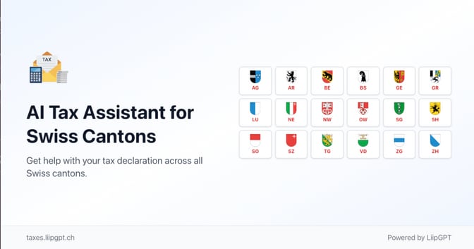 Building on our experience in generative AI and our LiipGPT solution, weâve developed taxes.liipgpt.ch, a chatbot designed to support you. It knows almost everything about taxes and is continuously updated with the latest information from cantonal tax authorities.