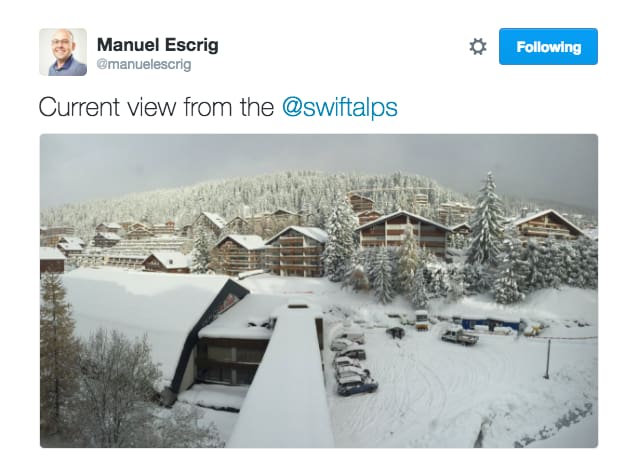 Last month my colleague Kilian and I were pleased to attend the Swift Alps Conference, an experimental conference about Swift taking place in the Swiss Alps. This conference had a different format from what one can expect from a typical software development conference. In this case the format was more focused in experimenting and collaborating with other attendees with the goal of learning something new.