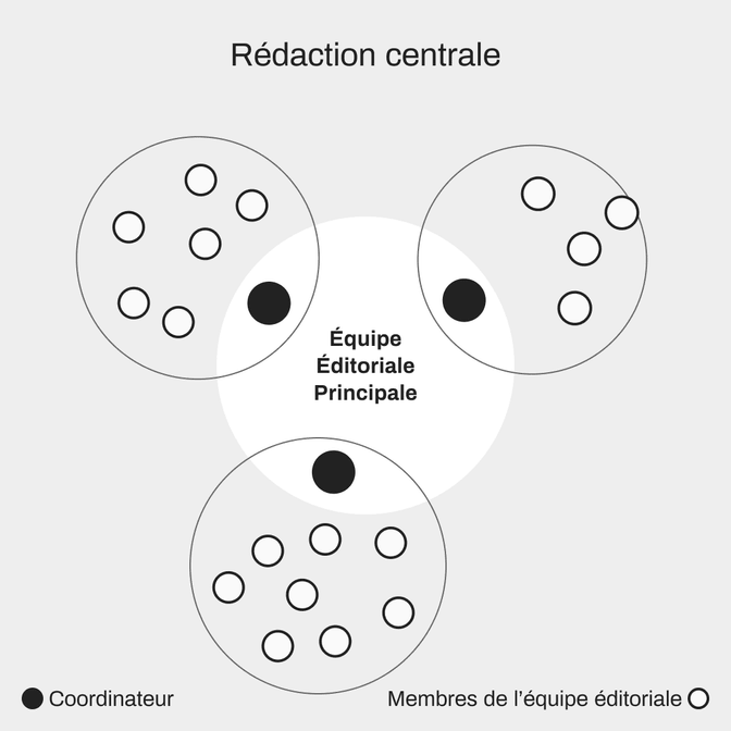 Pour la partie thĂ©matique, des Ă©quipes Ă©ditoriales par thĂšme ont Ă©tĂ© créées, chacune avec un·e coordinateur·rice. Iels servent dâinterface entre les Ă©quipes et la direction de projet. Lâorganisation de soutien (direction de projet + Liip) accompagne les Ă©quipes.